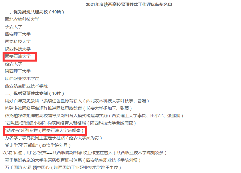 日前,陕西省高校易班发展中心组织开展2021年度全省易班共建高校评选活动,对易班建设先进集体和优秀个人进行表彰。我校被评为“优秀易班共建高校”,由我校申报的《朗读者》系列专栏被评为“优秀易班共建案例”,学生工作部(处)余靓豪同志被评为“优秀易班指导教师”,机械工程学院辅导员马舒宇老师被评为“优秀易班辅导员”,机械工程学院机械1904班仲衡同学被评为“优秀易班工作站站长”。
